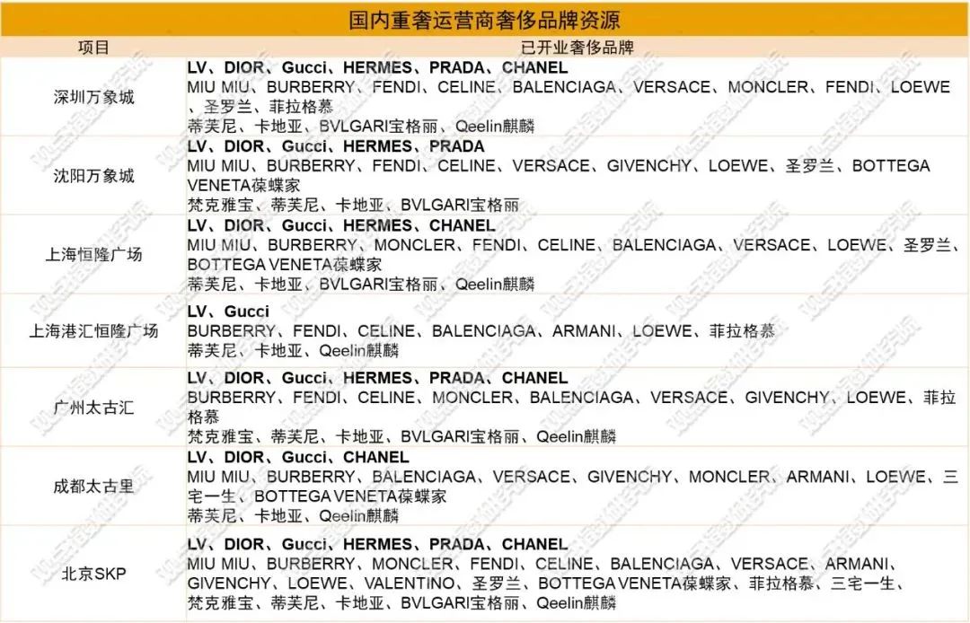 奢侈品品牌眾多,但能稱之為頂奢的屈指可數(shù),主要包括LV路易威登、DIOR迪奧、Gucci古馳、Hermès愛馬仕、PRADA普拉達(dá)、CHANEL香奈兒,是否引入上述品牌也是衡量重奢商業(yè)項(xiàng)目競爭力的重要指標(biāo)。