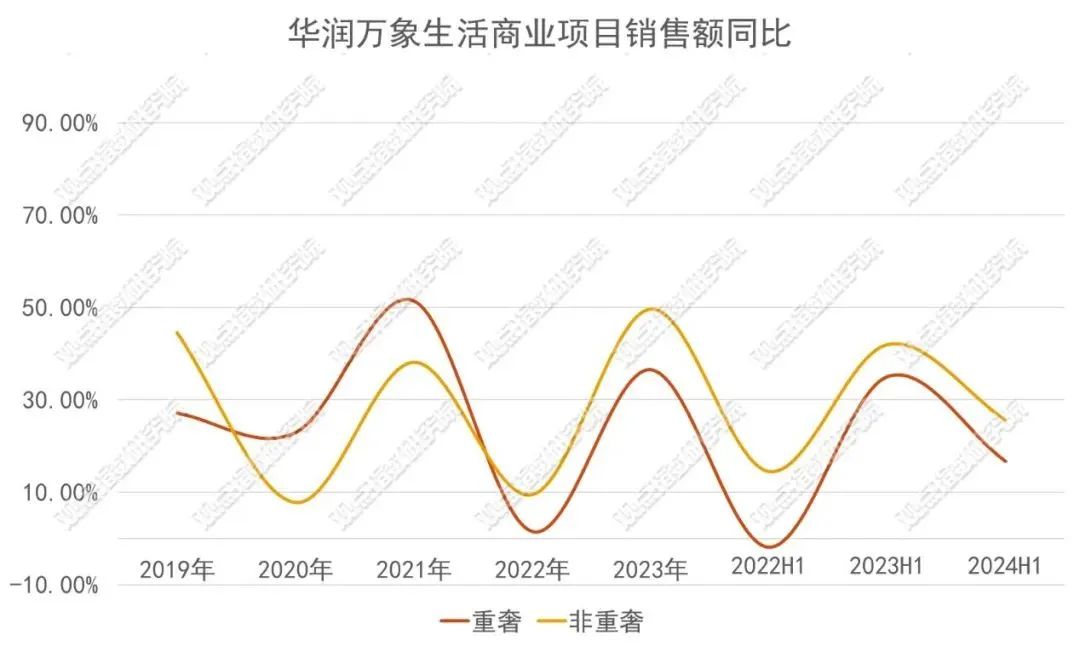 至于華潤萬象生活方面,同樣受到高端消費(fèi)整體環(huán)境的影響。2024上半年數(shù)據(jù)顯示,商業(yè)零售額同比增長19.7%,可同比增長7.6%;但重奢項(xiàng)目零售額同比增長9.6%,可同比增長4.0%,表現(xiàn)弱于整體,與非奢項(xiàng)目也有明顯差距,后者同比增長26.7%,可同比增長10.0%。