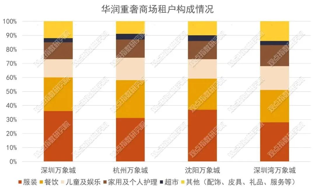 據(jù)觀點(diǎn)指數(shù)了解,華潤萬象生活重奢商場引入的品牌業(yè)態(tài)主要包括服裝、餐飲、兒童及娛樂、超市、家用及個(gè)人護(hù)理、其他(配飾、皮具、禮品、服務(wù)等)六大類。