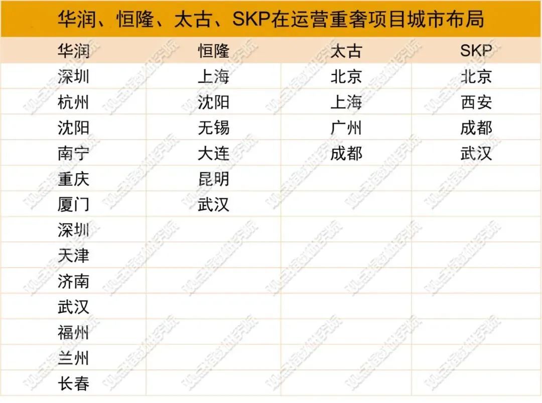 代表項(xiàng)目方面,三者均有王牌重奢商場,如上海恒隆廣場,北京華聯(lián)SKP,太古匯、太古里,以及華潤萬象城,均是消費(fèi)者心中的奢侈品購物圣地。