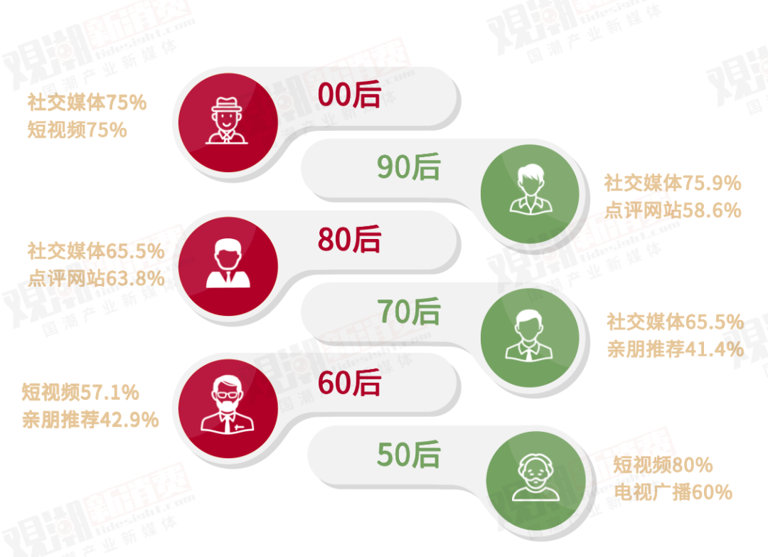 除社交媒體外,80、90后偏愛點(diǎn)評(píng)網(wǎng)站,70后青睞親朋推薦。