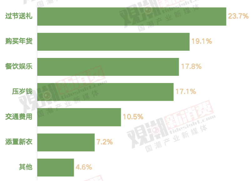 各項(xiàng)支出中,「過年送禮」「購買年貨」「餐飲娛樂」合計(jì)占比超60%,是三個(gè)春節(jié)“吞金獸”。