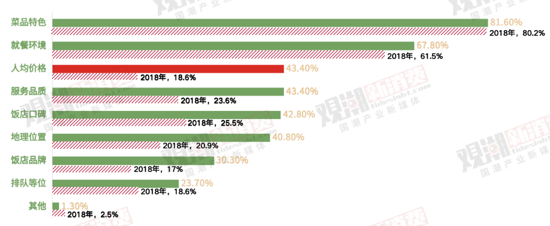 價(jià)格因素上升的同時(shí),考慮就餐環(huán)境、服務(wù)品質(zhì)、飯店口碑等各類因素的消費(fèi)者比例均有較大幅度提升。消費(fèi)者不會(huì)因?yàn)椤笆″X”就降低對(duì)體驗(yàn)的要求。