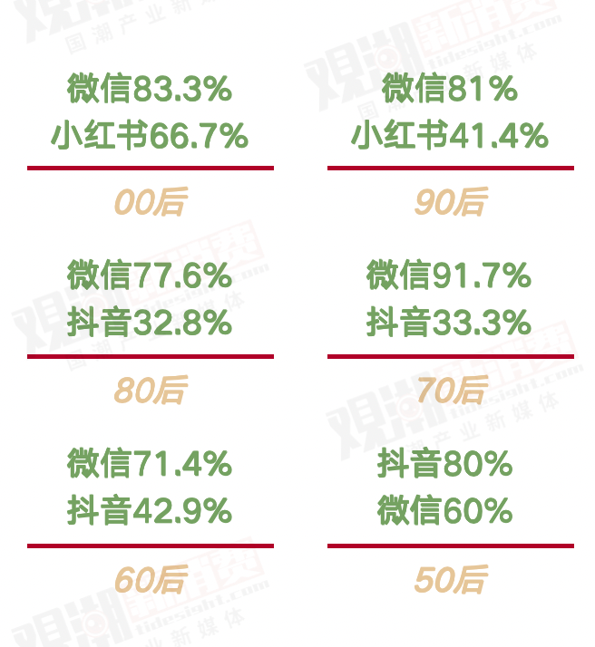 在分享春節(jié)假期生活的渠道選擇上,微信一騎絕塵;抖音是50后、60后最愛;小紅書則獲得90后、00后青睞。