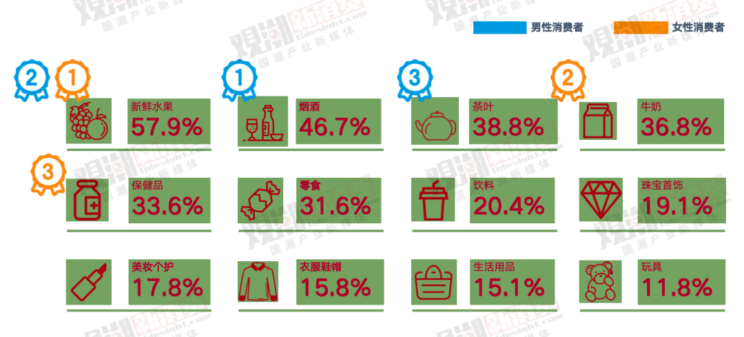 男性偏愛煙酒茶;女性偏愛保健營養(yǎng)。