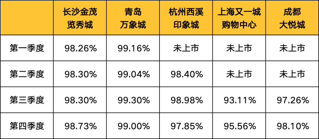 除百聯(lián)又一城外,其余項目均維持在97%以上的超高出租率水平。排名第一的青島萬象城更是全年都處于近滿租狀態(tài)。