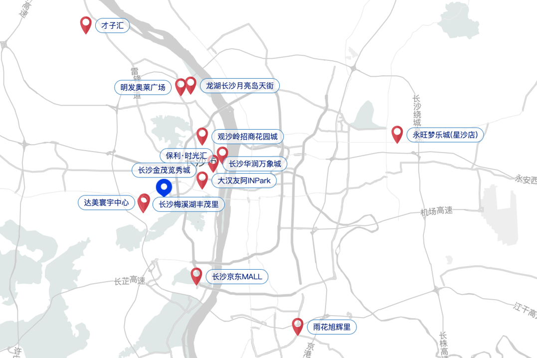 長沙共新開12個購物中心項目。其中與項目同屬岳麓區(qū)的有7個,距離最近的是3.2公里外的梅溪湖豐茂里,體量僅1.2萬平米,引入了麥當勞中國首家綠色童趣餐廳、山潮山·山林火鍋、躍測網(wǎng)球等品牌,從體量和品牌級次來看,基本對長沙覽秀城不構(gòu)成影響。