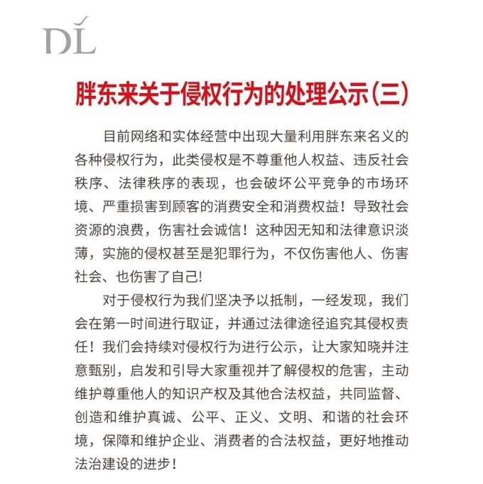對于侵權(quán)行為,胖東來堅(jiān)決予以抵制,并會持續(xù)對侵權(quán)行為進(jìn)行公示,讓大家知曉并注意甄別,啟發(fā)和引導(dǎo)大家重視并了解侵權(quán)的危害,主動維護(hù)尊重他人的知識產(chǎn)權(quán)及其他合法權(quán)益,共同監(jiān)督、創(chuàng)造和維護(hù)真誠、公平、正義、文明、和諧的社會環(huán)境,保障和維護(hù)企業(yè)、消費(fèi)者的合法權(quán)益。