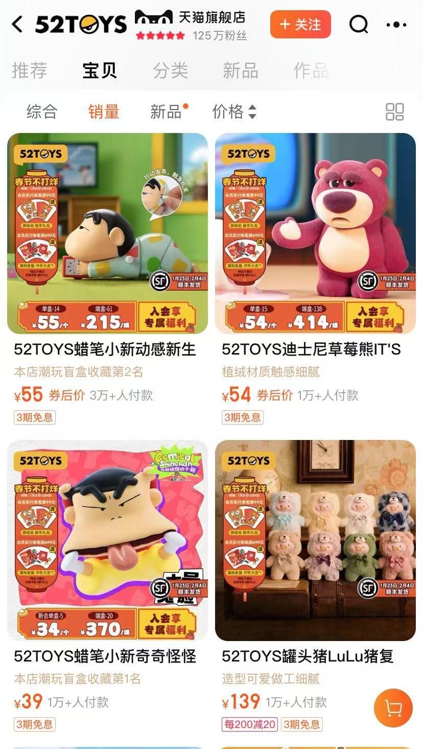 財報顯示,2023年,泡泡瑪特總營收和股東應(yīng)占溢利均創(chuàng)新高,分別為63.01億元、10.82億元。52TOYS雖未公布業(yè)績,但從電商平臺的銷量來看,能看出二者的差距。一電商平臺上,泡泡瑪特旗艦店中多款產(chǎn)品銷量上萬,其中超半數(shù)為泡泡瑪特的自有品牌。52TOYS旗艦店中,銷量上萬的產(chǎn)品僅有四款,其中前三個都是外部IP。