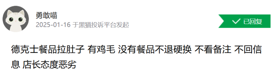 黑貓投訴平臺上,德克士的投訴量高達1322條,顧客們的抱怨集中在食品質(zhì)量差、外賣送餐超時、取消訂單不退款、客服態(tài)度差,甚至有人吃出雞毛、頭發(fā)等異物。