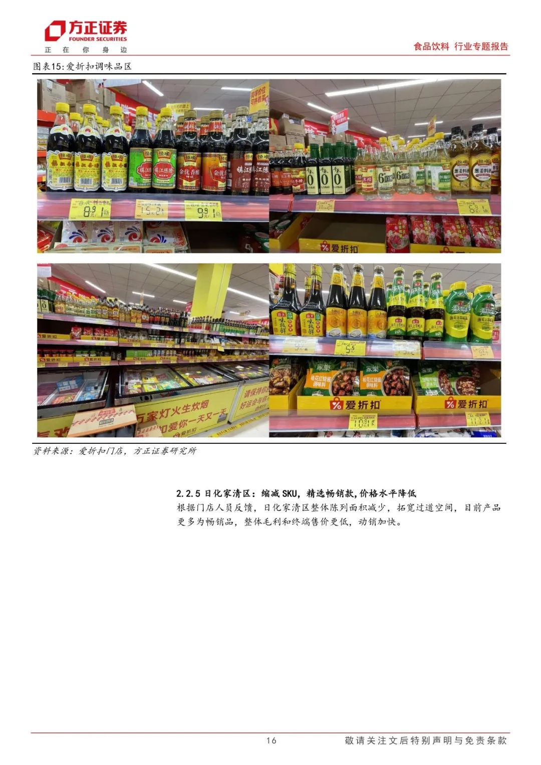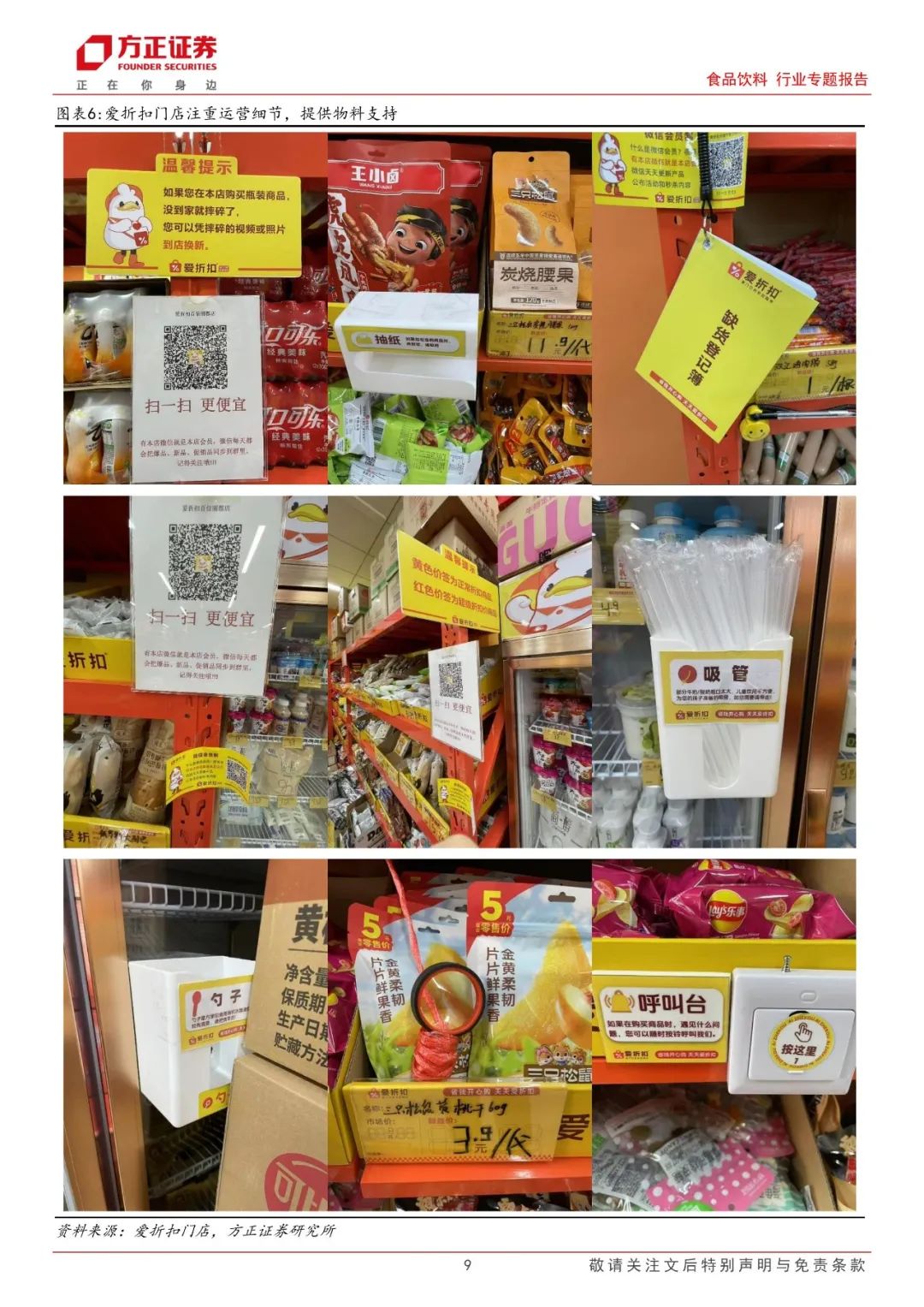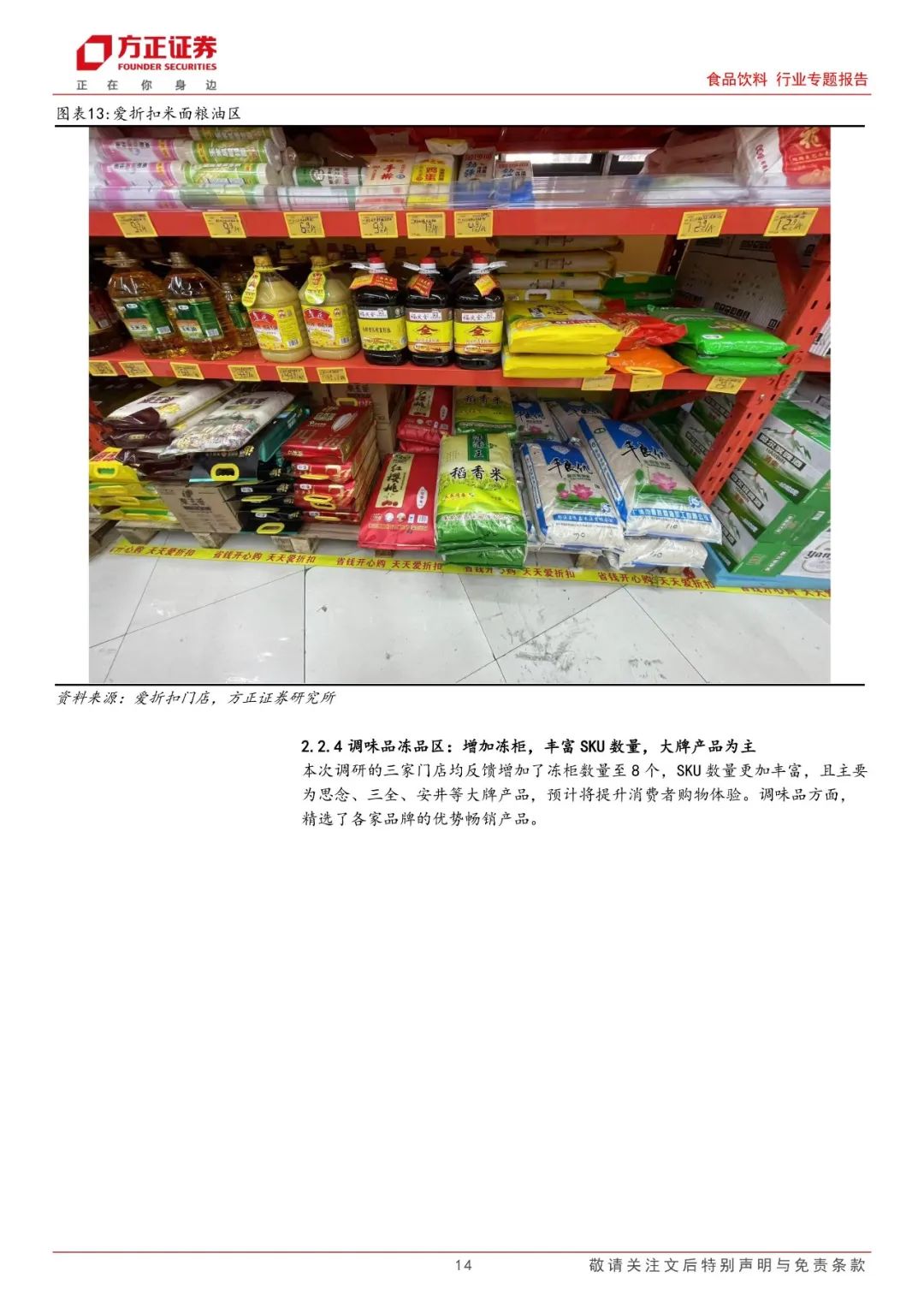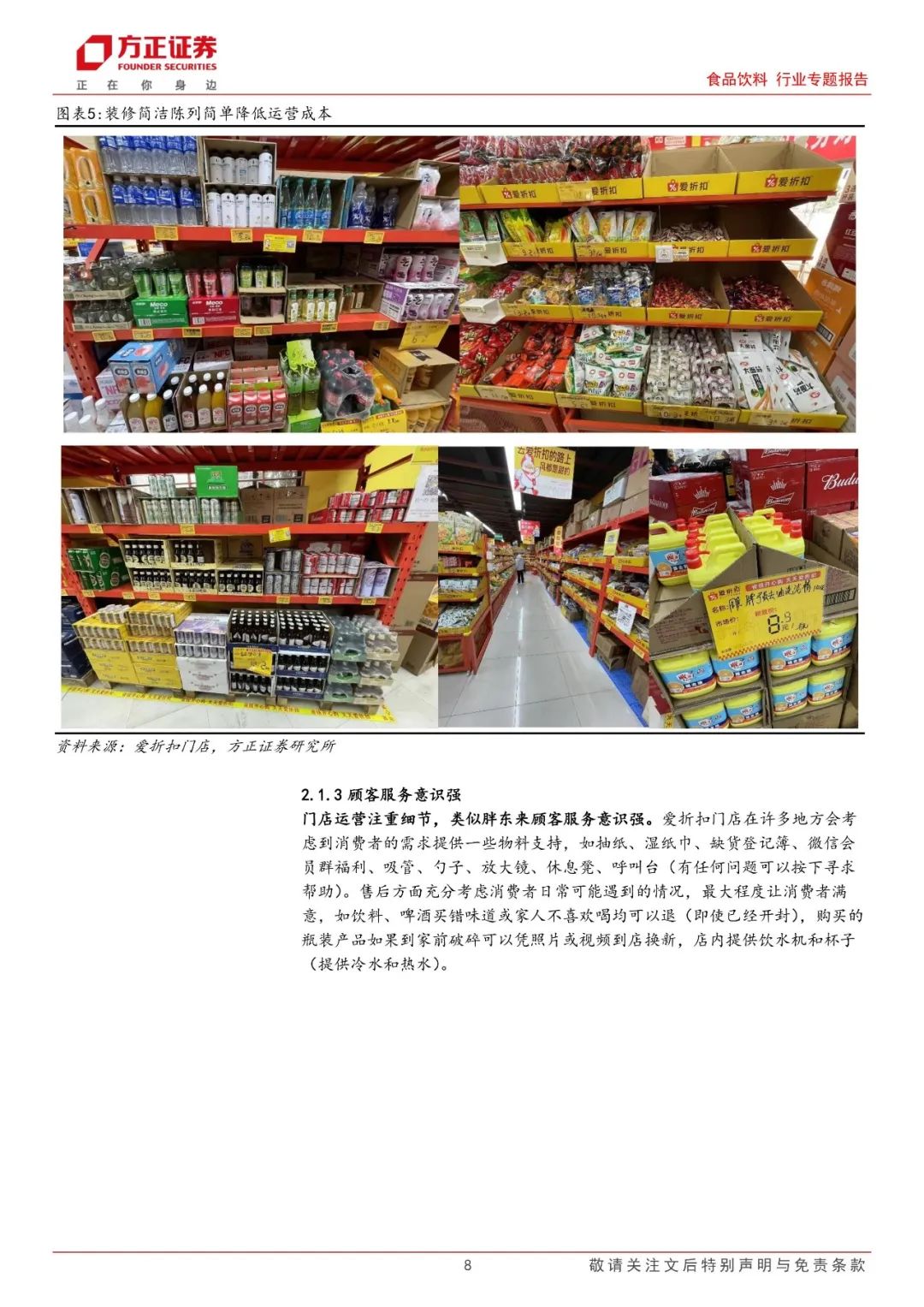 貨盤及價(jià)格梳理:零食水飲具備價(jià)格優(yōu)勢(shì),逐漸構(gòu)造更多品類優(yōu)勢(shì)。①零食:定量裝為主,性價(jià)比高,價(jià)格略低于零食量販店(愛(ài)折扣許多商品多件購(gòu)買有優(yōu)惠),顯著低于傳統(tǒng)商超。②水飲、乳品區(qū):與傳統(tǒng)超市相比,水飲、乳品區(qū)精選了一些暢銷的SKU產(chǎn)品。與零食量販店相比啤酒陳列面積更大,SKU更加豐富。典型的水飲價(jià)格較低,如小瓶裝農(nóng)夫山泉和怡寶均為1元,零食量販店一般為1.2元。③米面糧油調(diào)味品:優(yōu)選頭部品牌商品,SKU有所精簡(jiǎn)。④凍品區(qū):大牌為主,SKU豐富。⑤日化家清:精選暢銷款,價(jià)格水平與傳統(tǒng)超市相比更低。⑥玩具區(qū):擁有獨(dú)立陳列貨架,SKU數(shù)量適中。⑦商品貨齡較新,以硬折扣為主。