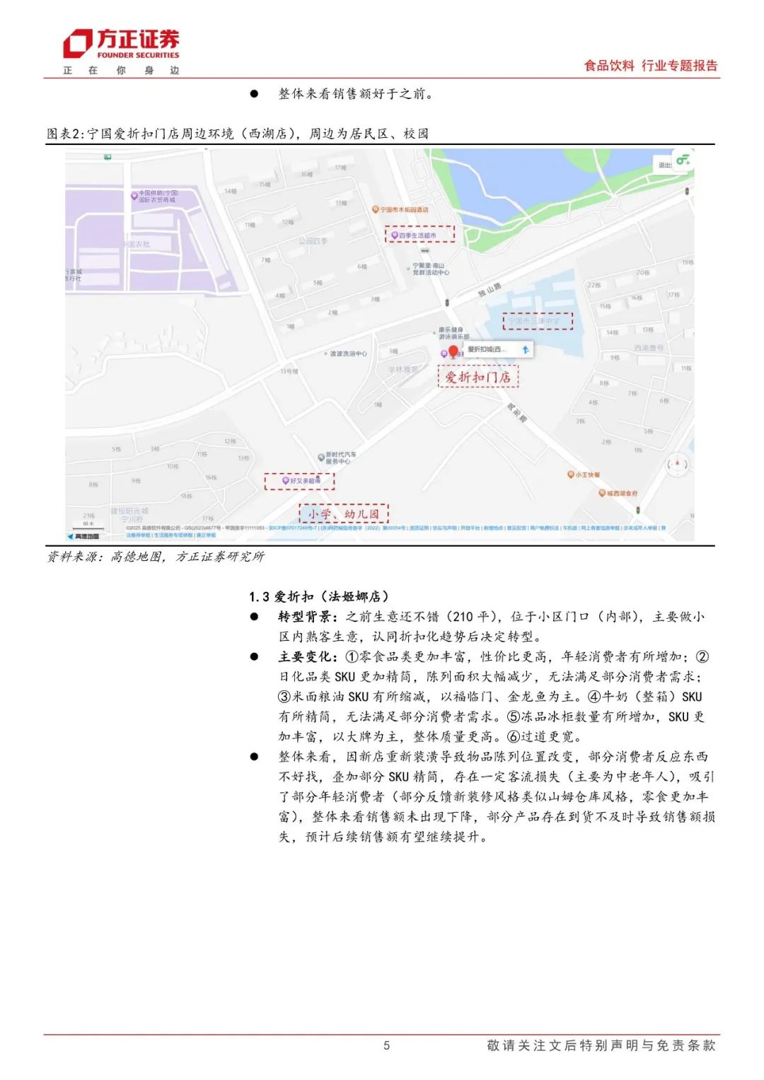 背景為傳統(tǒng)超市轉(zhuǎn)型,新店型貨品結(jié)構(gòu)進(jìn)一步升級(jí)優(yōu)化,生意有所改善。走訪的三家門店此前為傳統(tǒng)超市,主動(dòng)(看好折扣化趨勢(shì))或被動(dòng)(門店生意下滑)進(jìn)行轉(zhuǎn)型,新店型主要變化包括①零食品類更加豐富,性價(jià)比更高,年輕消費(fèi)者有所增加;②凍品區(qū)增加凍柜,SKU更加豐富,頭部品牌增多,整體貨品質(zhì)量顯著提升;③日化家清、米面糧油調(diào)味品、酒水陳列面積減少,SKU縮減為暢銷的幾款,整體價(jià)格水平降低,動(dòng)銷提升,過(guò)道更加寬敞。整體來(lái)看,門店客群更加年輕化,生意有所改善。