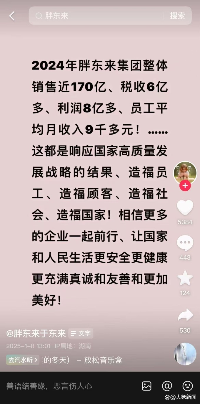 早前的1月8日,于東來在抖音發(fā)文透露,2024年胖東來集團整體銷售近170億,稅收6億多、利潤8億多,員工月均收入9千多元。