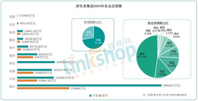 在業(yè)態(tài)方面,超市實現(xiàn)銷售額80.94億元,占比47.71%;百貨方面,實現(xiàn)銷售額23.41億元,占比13.80%;電器部門則實現(xiàn)銷售額21.02億元,占比12.39%;珠寶部門實現(xiàn)銷售額15.46億元,占比9.11%,這是胖東來銷售排名前四的主力部門。