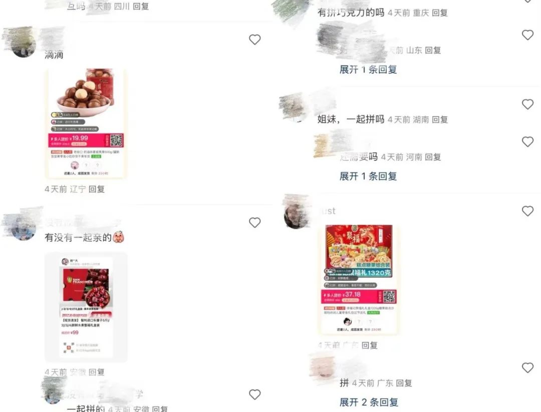 靈機(jī)一動(dòng)的橘媽,在社交平臺(tái)發(fā)起了拼單群,沒(méi)想到有不少姐妹求入群。還有不少網(wǎng)友在橘媽的評(píng)論區(qū)發(fā)帖不同年貨拼單商品,包括零食糖果組合、水果禮盒等等。