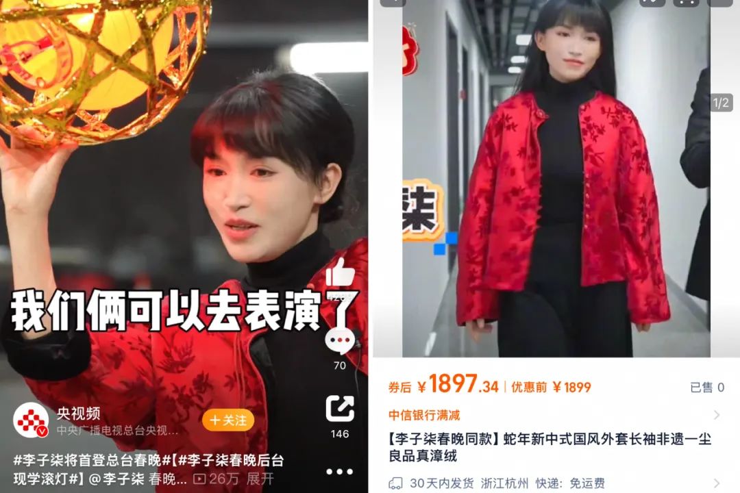 實際上,在春晚正式開演的前幾小時,李子柒在央視采訪中的一款暗紅色的新中式外套就已經(jīng)火了。新中式服飾商家“一塵良品”在李子柒登臺后便在淘寶迅速上架了同款漳絨外套,稱:“李子柒首次上春晚,講述漳絨非遺故事,同款外套淘寶首發(fā)!