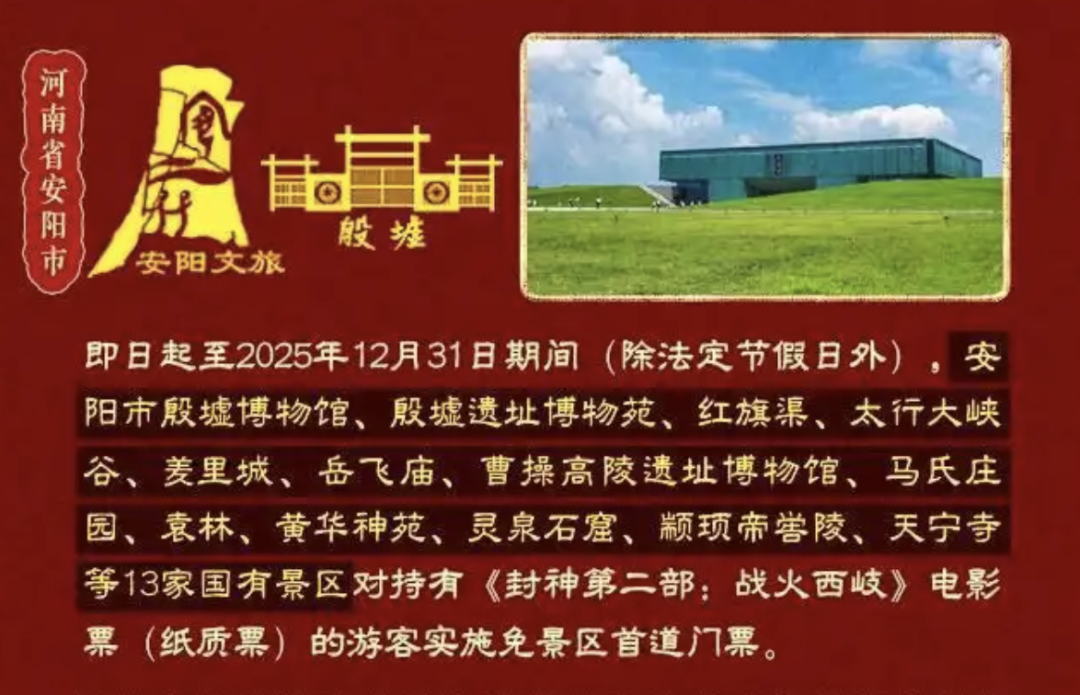 由此來看,降低消費者的綜合觀影成本是讓觀眾重新走進(jìn)電影院的一個思路。例如推出綜合折扣更低的會員卡,聯(lián)動餐飲品牌推出觀影折扣券,又或者是聯(lián)合線上平臺補(bǔ)貼推出特別時段的觀影券。而《封神2》在上映期間,就聯(lián)動安陽市殷墟博物館、殷墟遺址博物苑、紅旗渠等13家國有景區(qū),推出持電影票根免景區(qū)首道門票的活動。