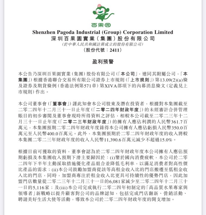 百果園預(yù)計(jì)2024年最高虧損4億,一年關(guān)店近千家