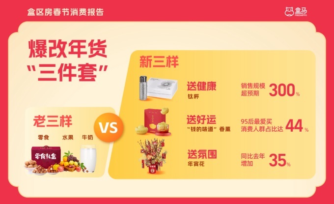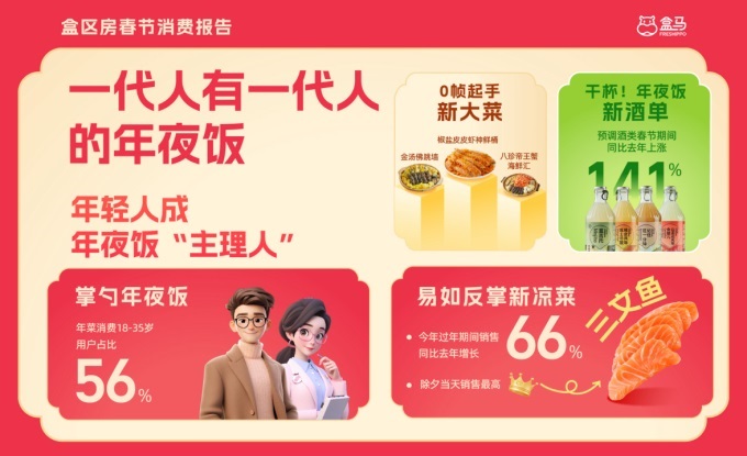 2月5日,盒馬發(fā)布的《2025盒區(qū)房春節(jié)消費(fèi)報(bào)告》(以下簡(jiǎn)稱“報(bào)告”)顯示,18-35歲年輕人已經(jīng)成為盒區(qū)房的春節(jié)“主理人”,全權(quán)接手辦年貨,準(zhǔn)備年夜飯,營(yíng)造過(guò)年氛圍等事項(xiàng)。在他們的主導(dǎo)下,春節(jié)消費(fèi)也開(kāi)始顯現(xiàn)新趨勢(shì):“賽博”年菜增長(zhǎng)翻倍;“小甜水”爆發(fā)式增長(zhǎng);三文魚(yú)成最受歡迎的“涼菜”……此外,更新奇、情緒價(jià)值以及性價(jià)比拉滿的“情價(jià)比”好貨成為最受年輕人青睞的春節(jié)伴手禮。