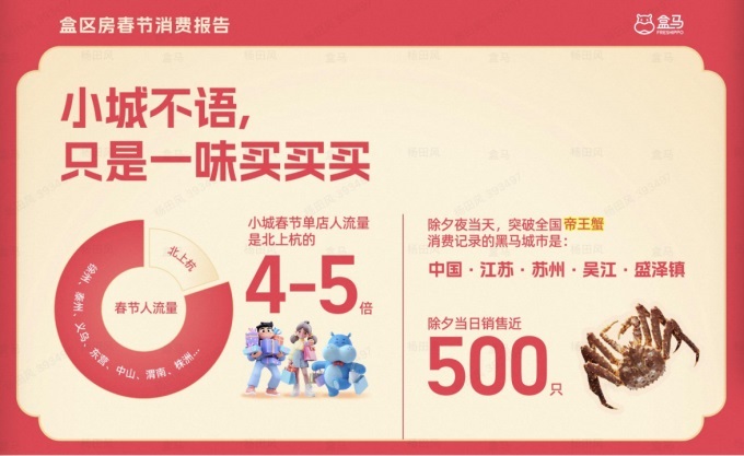 春節(jié)期間,廣大網(wǎng)友紛紛在社交平臺曬出年夜飯,帝王蟹、波士頓大龍蝦、三文魚等進(jìn)口海鮮霸占餐桌C位。數(shù)據(jù)顯示,盒馬春節(jié)海鮮水產(chǎn)銷售同比去年增長近四成,以二三線及縣域城市消費增速最快。其中,帝王蟹在除夕夜的全國銷量TOP3分別是盛澤、義烏、揚(yáng)州3家店。值得一提的是,盛澤店作為盒馬首家鎮(zhèn)級門店,更是突破全國紀(jì)錄單天最高賣出近500只。