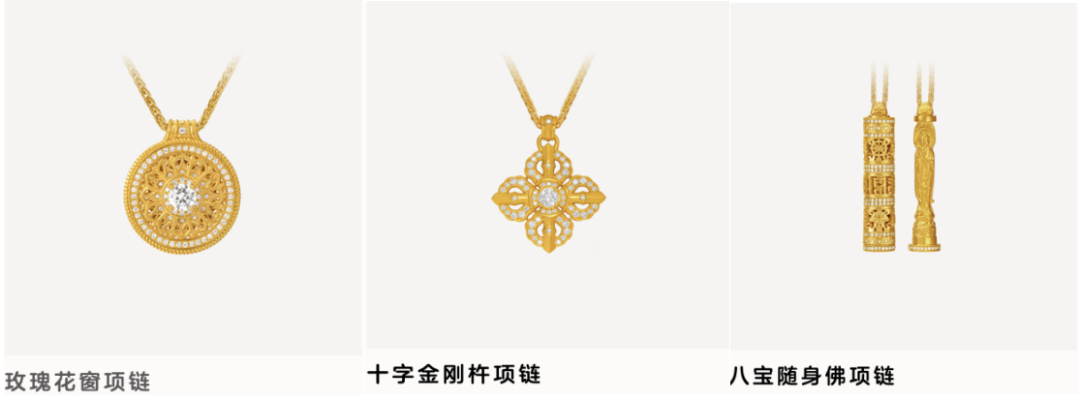 老鋪黃金的產(chǎn)品,有40%左右單價(jià)集中于1萬(wàn)元-25萬(wàn)元,瑰花窗、十字金剛杵、隨身佛等飾品以經(jīng)典設(shè)計(jì)和精湛工藝深受歡迎。