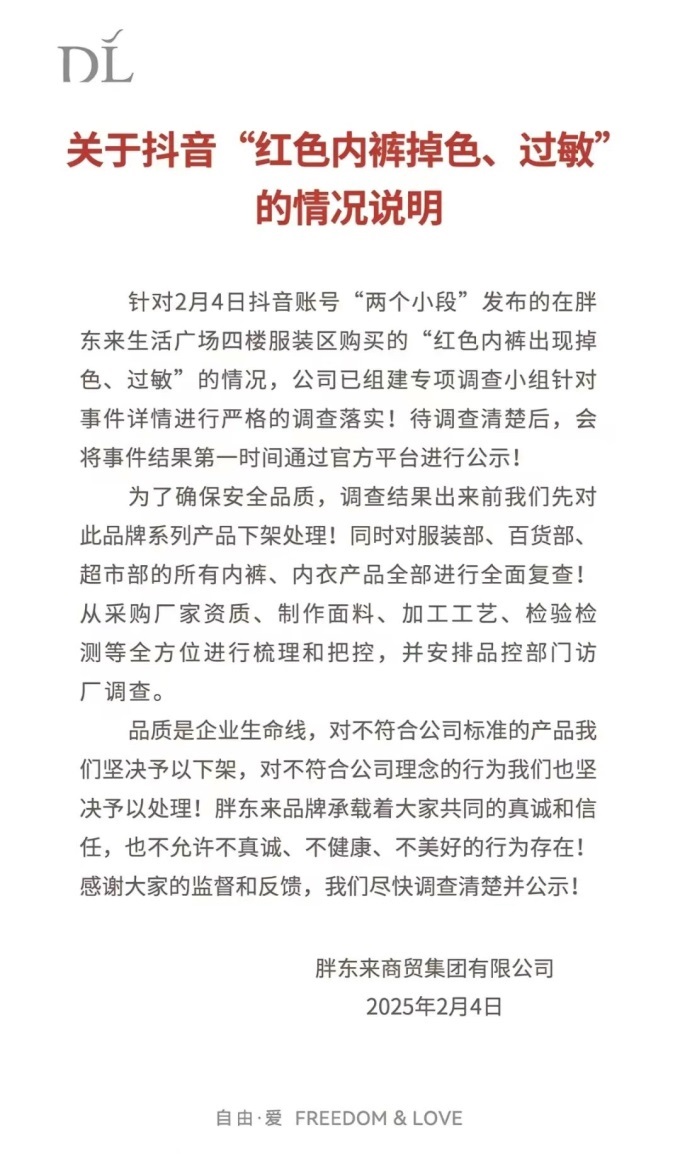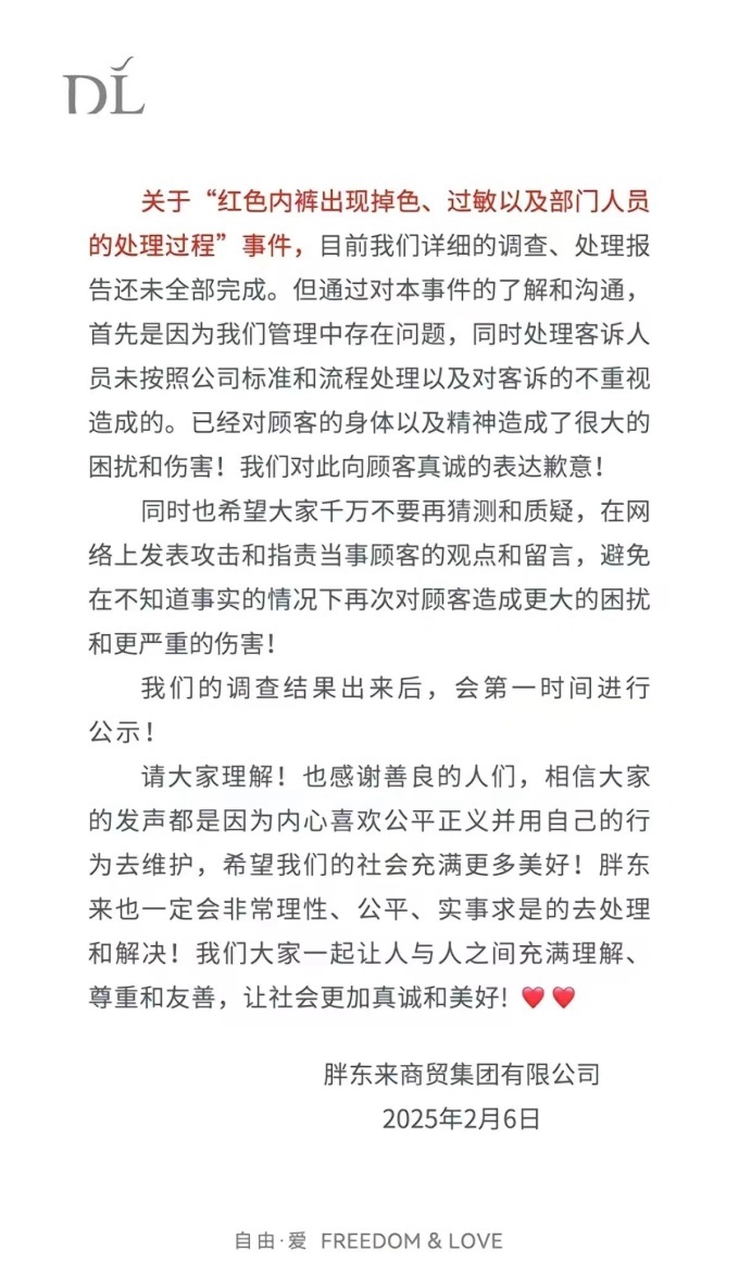 2月6日,胖東來商貿(mào)集團有限公司在官方抖音號上鄭重發(fā)聲,就“紅色內(nèi)褲出現(xiàn)掉色、過敏及部門人員的處理過程”事件做出說明。胖東來表示,目前紅色內(nèi)褲事件報告還未完成,但初步了解是內(nèi)部管理存在問題,對于此事給顧客造成的困擾和傷害,向顧客表達真誠的歉意。