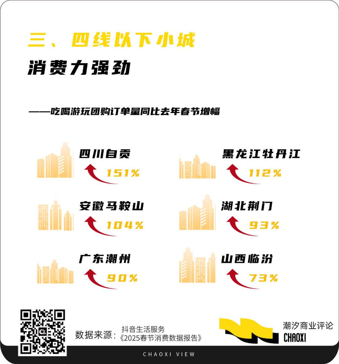 電商平臺們的數(shù)據(jù)也揭示了下沉市場的驚人爆發(fā)力。據(jù)抖音生活服務發(fā)布的《2025春節(jié)消費數(shù)據(jù)報告》顯示,今年春節(jié)期間,“旅游過年”“返鄉(xiāng)探親”推動三、四線以下小城消費快速增長。1月28日至2月3日,四川自貢、黑龍江牡丹江、安徽馬鞍山等地抖音吃喝游玩訂單量同比增長超 1 倍。湖北荊門、廣東潮州、山西臨汾等特色小城抖音團購訂單量也分別增長了93%、90%和73%。