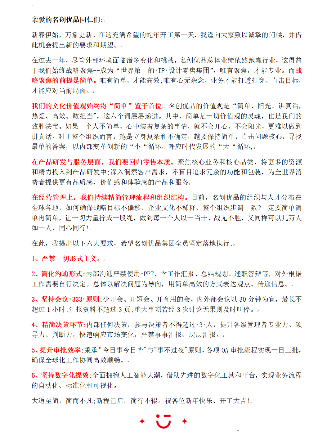 既美的集團(tuán)大力禁止形式主義后,名創(chuàng)優(yōu)品也強(qiáng)力發(fā)聲:嚴(yán)禁一切形式主義!
