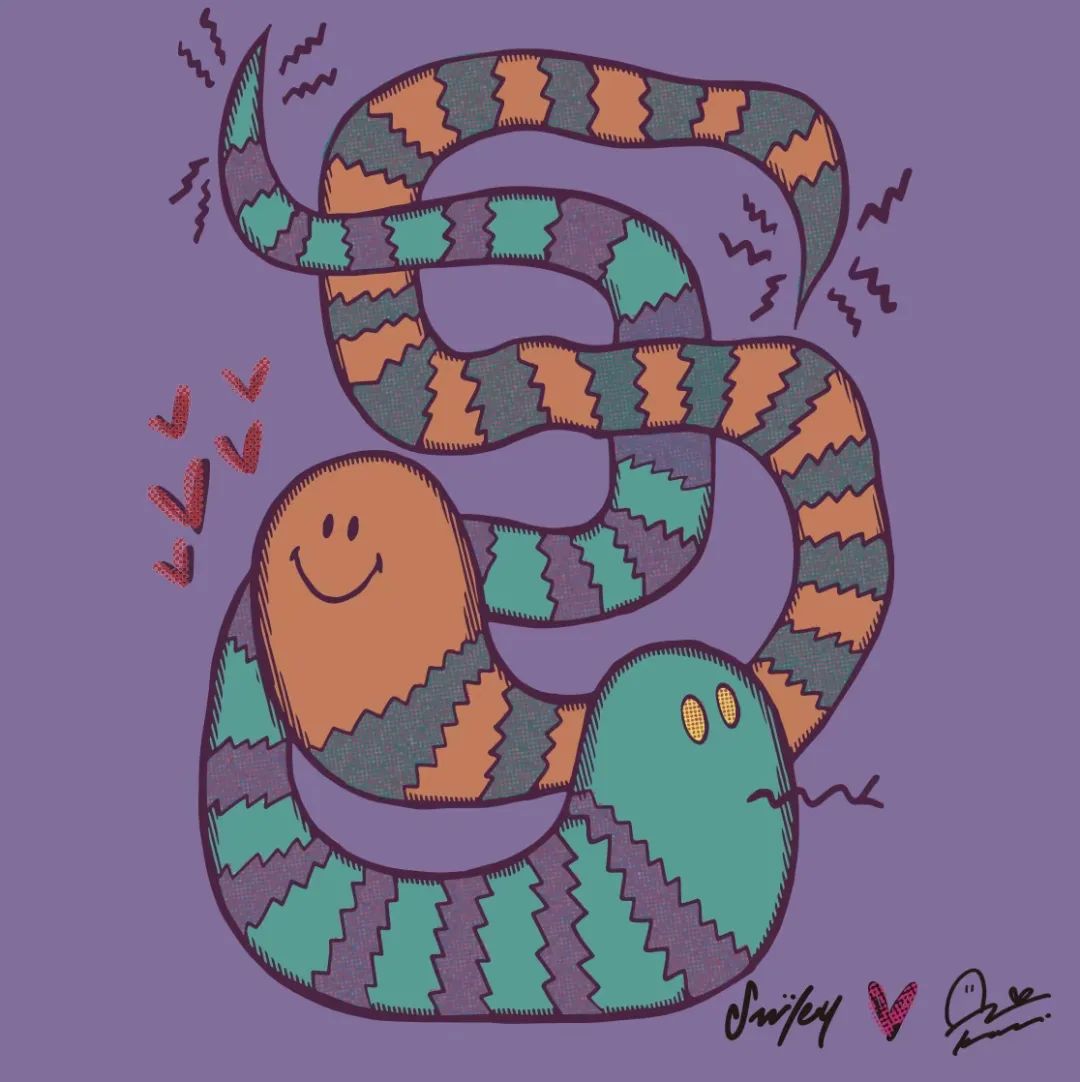 其中一幅名為“蛇遂如意”的作品,藝術(shù)家以蛇為靈感,用鮮艷的色彩與飄逸的線條,為RatFace和SMILEY勾勒出了蜿蜒靈動(dòng)的尾巴,在相互的碰撞交融中創(chuàng)造出了詼諧又喜慶的畫面,表達(dá)了對(duì)農(nóng)歷“蛇年”的美好祝福。