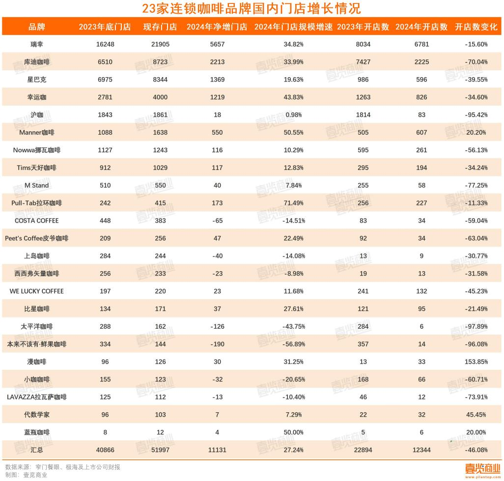 2024年,壹覽商業(yè)長期跟蹤的23家連鎖咖啡品牌新開門店12344家,相較于2023年同期的22894家,同比下降了46.08%,門店總數(shù)達(dá)到51997家。