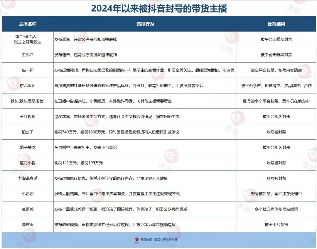 根據(jù)抖音此前發(fā)布的2024年直播治理報(bào)告,報(bào)告期內(nèi),抖音共無限期回收直播權(quán)限賬號(hào)32萬個(gè),清退直播機(jī)構(gòu)526家,其中不乏部分超頭主播。據(jù)青眼不完全統(tǒng)計(jì),2024年以來,已至少有13位粉絲數(shù)量達(dá)百萬級(jí)甚至千萬級(jí)的帶貨主播賬號(hào)被封禁。