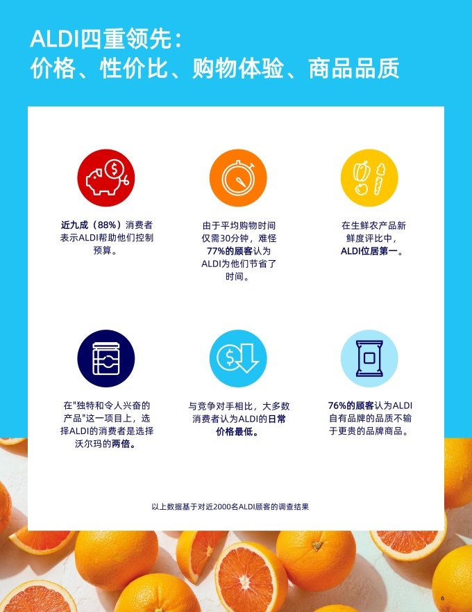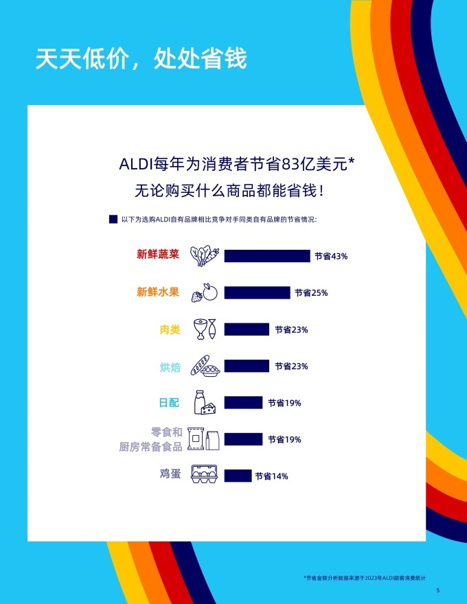 (1) 與其他超市相比,消費者在ALDI購物平均可節(jié)省高達36%的開支。價格對比分析顯示,無論消費者在其他超市購買什么商品,轉向ALDI都能省下一大筆錢。具體而言,一個四口之家若從品牌商品轉向選購ALDI自有品牌,每年在食品雜貨上可節(jié)省近4000美元(約合2.92萬人民幣)。