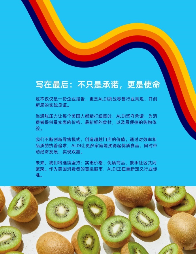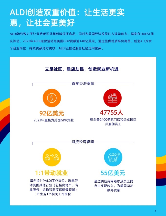(3) ALDI的影響力遠超賣場范圍。ALDI委托QUEST團隊分析了其在美業(yè)務過去八年的經濟影響。分析顯示,2023年ALDI的運營為美國經濟貢獻了約140億美元(約合1020億人民幣),直接和間接創(chuàng)造了超過9萬個就業(yè)崗位。未來五年ALDI計劃新開800家門店,隨著業(yè)務持續(xù)擴張,將為當?shù)厣鐓^(qū)帶來更大的經濟效益。
