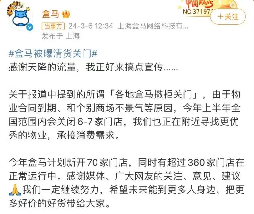 一個明顯的現(xiàn)象是,2024年上半年,盒馬鮮生陸續(xù)關閉6-7家門店,沈陽、海南等地已經(jīng)“查無此馬”。官方給出的原因為:物業(yè)到期和商場不景氣等。