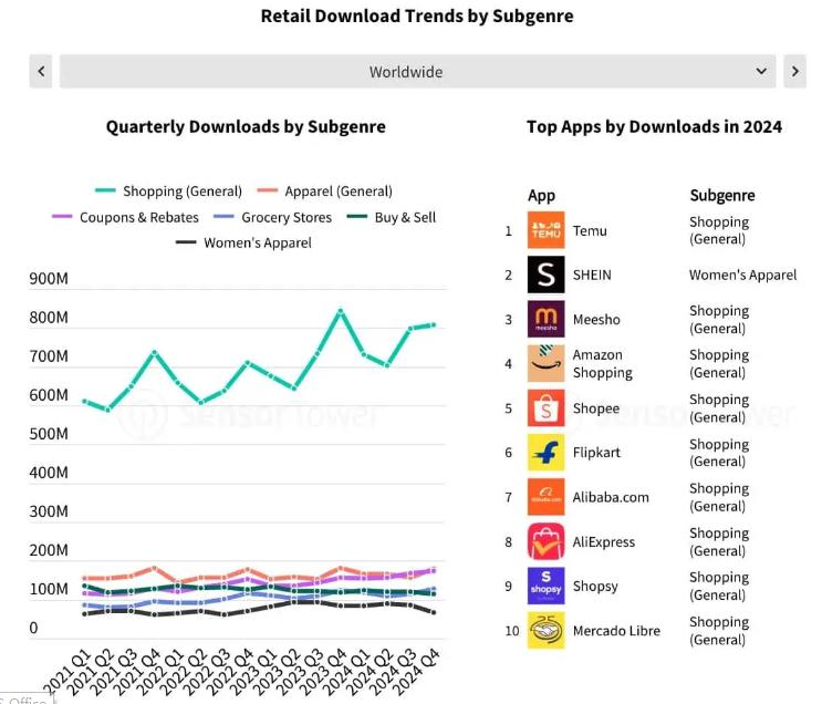 另?yè)?jù)Sensor Tower的《2024年電商應(yīng)用及電商相關(guān)品牌市場(chǎng)洞察》,2024年,Temu全球下載量達(dá)5.5億,同比增長(zhǎng)69%。截至2024年12月,Temu全球累計(jì)下載量接近9億次,牢牢占據(jù)全球電商應(yīng)用下載量和增速的榜首。
