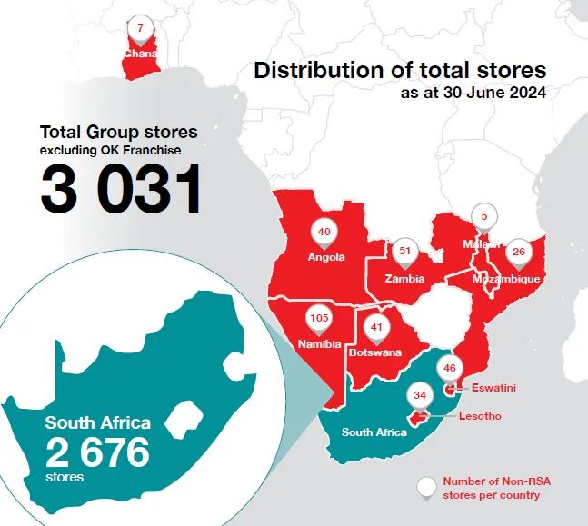 2024財(cái)年,Shoprite集團(tuán)實(shí)現(xiàn)總收入2407億蘭特(約920億元人民幣),同比增長(zhǎng)12.0%。其核心業(yè)務(wù)南非超市部門(Supermarkets RSA)貢獻(xiàn)了1950億蘭特(約772.2億元人民幣),占總收入的81%,增長(zhǎng)12.3%。集團(tuán)在全球范圍內(nèi)新開設(shè)343家門店,使總門店數(shù)量進(jìn)一步擴(kuò)大。員工總數(shù)達(dá)15.69萬人。
