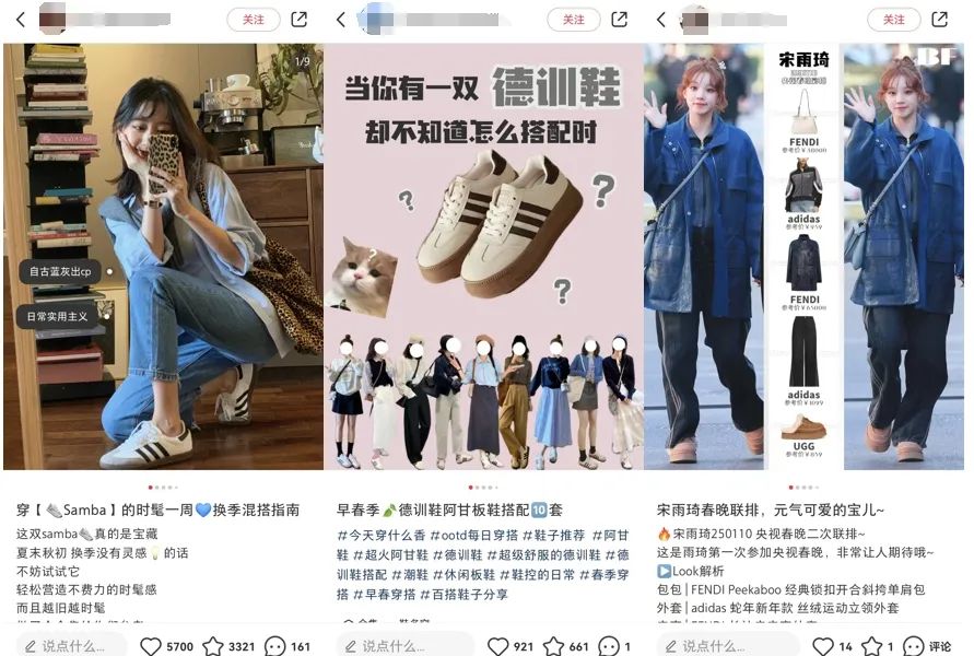 在小紅書搜索關(guān)鍵詞“德訓(xùn)鞋女穿搭”可以看到26萬+篇筆記和32萬+件商品,包括大批Jennie同款穿搭指導(dǎo),根據(jù)咨詢機構(gòu)Laced的統(tǒng)計,2023年該系列產(chǎn)品銷售額同比增長超20倍。宋雨琦去錄制《跑男》時穿的三葉草系列運動鞋、參加春晚彩排的運動褲,也成了社交平臺上的爆款。