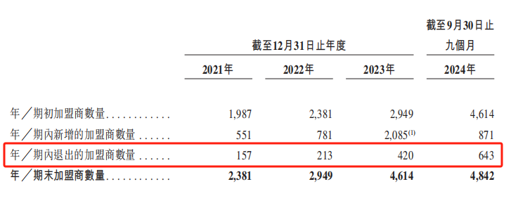 2024年前三季度,古茗新加盟871人、退出643人,總加盟商4842人,加盟商流失率從2021年的6.2%提升至11.7%。短短3年,加盟商流失率近乎翻了1倍。