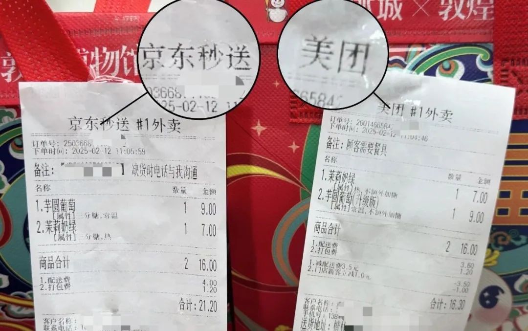 2月12日11:04,我在美團(tuán)和京東兩個(gè)平臺(tái)上(點(diǎn)單地在鄭州),同時(shí)下單了1.5公里之外的同一家蜜雪冰城的2杯同款產(chǎn)品,發(fā)現(xiàn)作為外賣(mài)新手的京東,在服務(wù)細(xì)節(jié)及效率上還有較大提升空間。