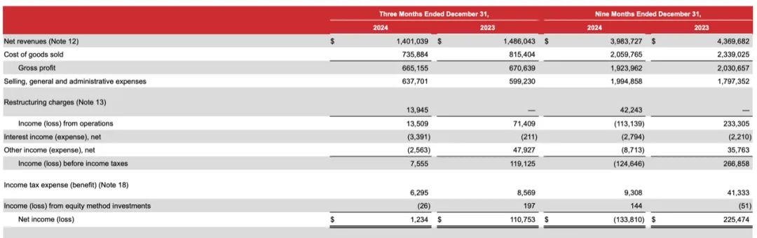 安德瑪2025財(cái)年第三季度財(cái)報(bào)顯示,公司收入同比下降6%至14億美元。不過,毛利率增長240個(gè)基點(diǎn)至47.5%,毛利潤達(dá)到6.65億美元,凈收入為123.4萬美元,營業(yè)收入1350萬美元。
