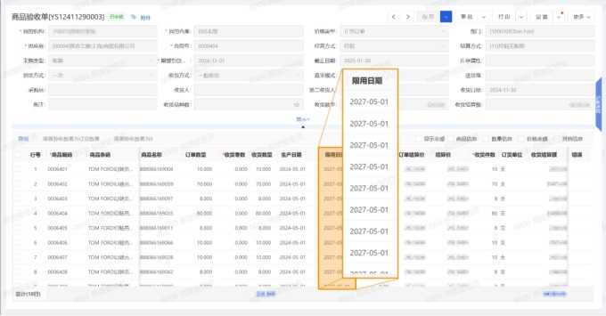 保質期管理是高端化妝品自營業(yè)務中極其重要的一個環(huán)節(jié),以往手動記錄的模式在通過數(shù)字化升級后也有了更為高效的管控方式。一般高端化妝品會在商品上標注其有效期,在商品的驗收環(huán)節(jié)中通過手機端可以直接錄入商品的批號以及有效期,系統(tǒng)中將會通過商品編碼+批號的方式進行管理,這樣就可以清晰地了解到同一SKU下商品不同有效期的情況。