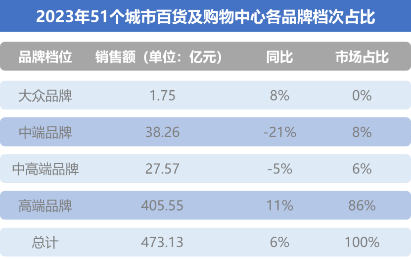 尼爾森數(shù)據(jù)顯示全國51個城市百貨、購物中心化妝品銷售額中只有高端品牌實現(xiàn)銷售額增長,且市場占比達到了驚人的86%,遠超大眾品牌、中端品牌、中高端品牌三類品牌檔次的總和。這意味著,高端化妝品品牌的線下“主戰(zhàn)場”,在2023年煥發(fā)出新的生機。
