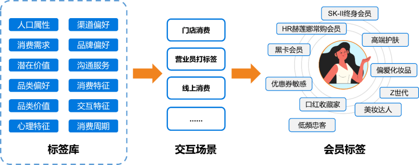 高端化妝品自營的管理,可以讓企業(yè)在最細化的顆粒度中洞察顧客訴求,比如顧客的商品喜好、購買習慣、客單等等,結合會員的權益玩法、精準營銷等能夠有效地拉升客群粘性。比如:“顧客”在3個月內購買了SK-II神仙水2次,我們就可以獲取到顧客的商品喜好、商品使用習慣等,為其打上“高端護膚”的標簽。