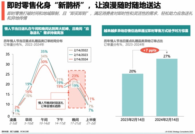 即時零售打破時間和地域限制,也真化身為“新鵲橋”,便利更多異地戀情侶及時給到浪漫驚喜。餓了么數(shù)據(jù)顯示,過去2年,情人節(jié)當天禮贈品類中的異地訂單占比,從2023年的20%增長到2024年的27%。