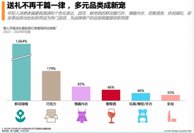 在OC&C大中華區(qū)合伙人江宜璁看來,以餓了么為代表的即時零售平臺正在重塑情人節(jié)送禮市場,打破時間與空間限制,滿足消費者對”即刻浪漫”的需求。送禮人、品類、方式更加多元且跳脫傳統(tǒng),為情人節(jié)送禮帶來更多機遇,成為品牌拓展觸點、激發(fā)增量需求、創(chuàng)造熱點、打造品牌價值與增長引擎的“新“抓手。