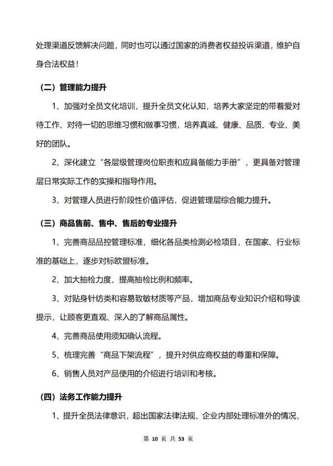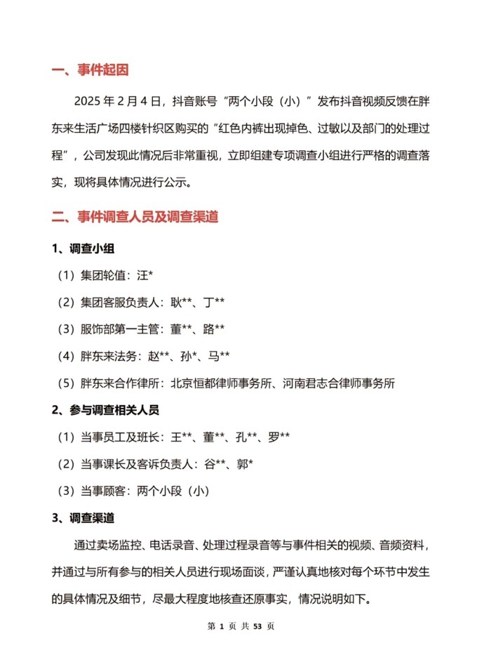 該報告共53頁,詳細(xì)說明了事件起因、事件調(diào)查人員及調(diào)查渠道、調(diào)查情況與分析、商品質(zhì)量落實、處理方案和整改方案,同時附上了民主合議庭和商品檢測報告。