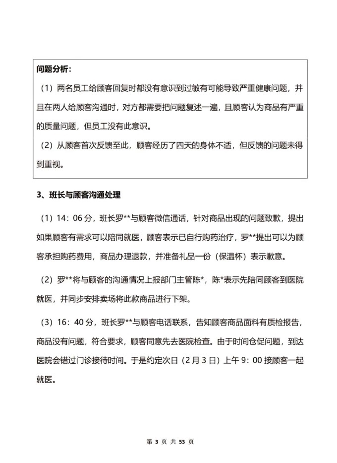 2月2日(初五):胖東來兩位員工先與顧客溝通;當(dāng)天下午,班長羅**與顧客溝通處理,并約定次日上午陪同顧客就醫(yī)。