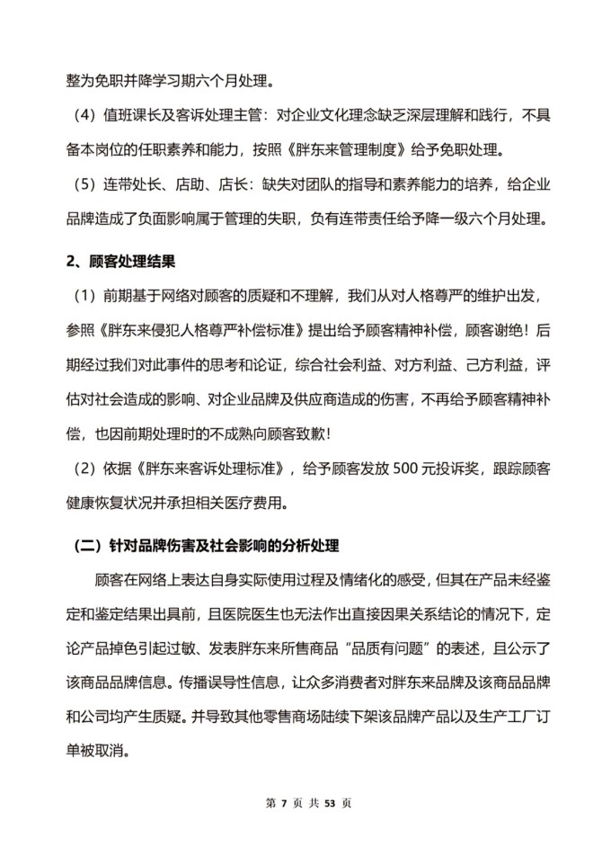 (2)依據(jù)《胖東來客訴處理標(biāo)準(zhǔn)》,給予顧客發(fā)放 500 元投訴獎,跟蹤顧客健康恢復(fù)狀況并承擔(dān)相關(guān)醫(yī)療費用。