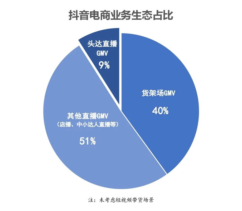 但這些關(guān)注度高的頭部達(dá)人所帶來的GMV在抖音電商的大盤占比并不高。抖音電商最終依靠貨架場景以及店播(商家自播)的表現(xiàn),彌補(bǔ)了GMV目標(biāo)的缺口。
