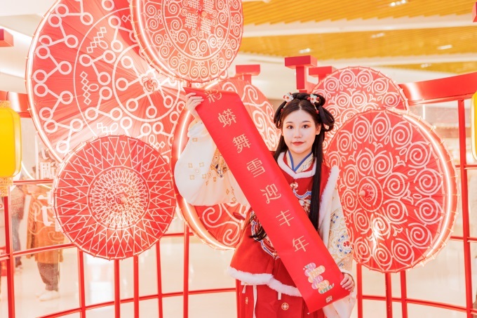 SM成都則融入彝族風情,打造“東方腔調·民族文化節(jié)”四大場景:外廣場以彝族刺繡及拱斗結構為創(chuàng)作靈感,創(chuàng)意呈現【孜莫格尼·吉祥如意】;2號門【日“富”“彝”日】和5號門的【年“富”“彝”年】,吸取彝族建筑風格和搭建工藝,巧妙嵌入彝族木椅、黃油傘、刺繡地毯等特色單品,展現彝族獨特文化魅力!2樓中庭的【好運“彝”年】,則以彝族傳統紋樣,搭配中國紅燈籠落地,為超10萬市民送上濃郁的彝族風情新春。